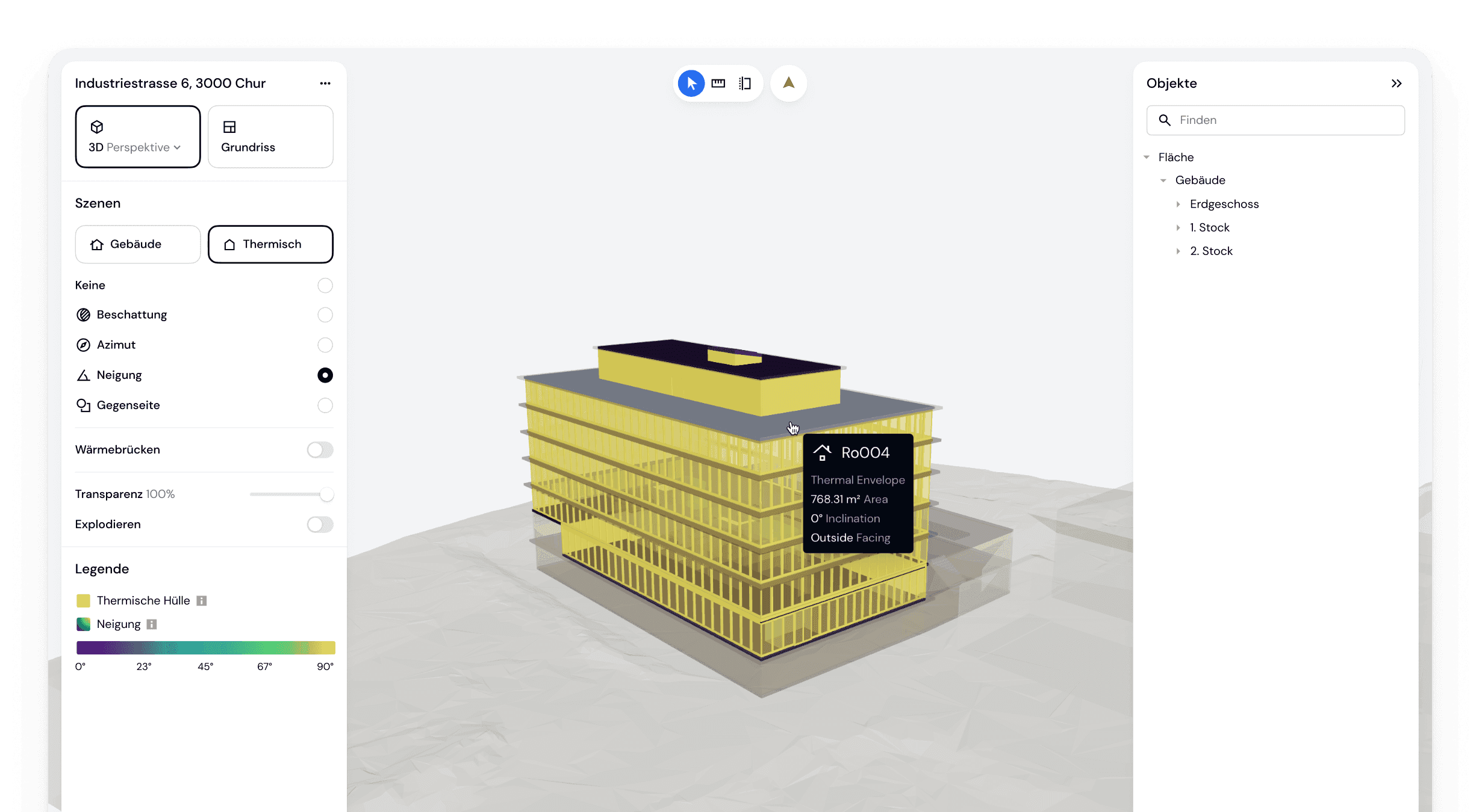 Basierend auf dem 3D-Modell bestimmen wir die thermische Gebäudehülle, die Energiebezugsfläche und Wärmebrücken, was eine akkurate energetische Analyse des Gebäudes ermöglicht.
